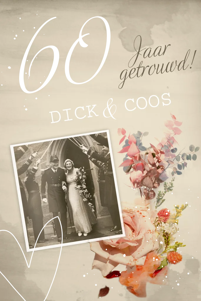 Stijlvolle vintage uitnodiging voor een prachtig jubileum, 60 jaar getrouwd! Deze kaart heeft een vintage look en geeft helemaal dat gevoel van vroeger weer. Hoe leuk is het om een oude foto te plaatsen van het bruidspaar en op de achterkant een recente foto. De kaart heeft een mooie illustratie van bloemen en een getekend hartje. Verschillende elementen worden in zilverfolie gedrukt, dat zorgt voor een unieke kaart!