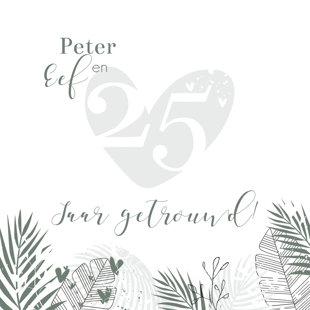 Trendy uitnodiging voor jullie 25-jarig huwelijksjubileum met botanische elementen en foliedruk. Onderaan de kaart verschillende takjes. De namen staan in een speels lettertype naast het hart met 25 met kleine hartjes erboven. Door de verschillende elementen in foliedruk krijgt de kaart een luxe uitstraling. In de online editor kun je het ontwerp naar eigen wens aanpassen.