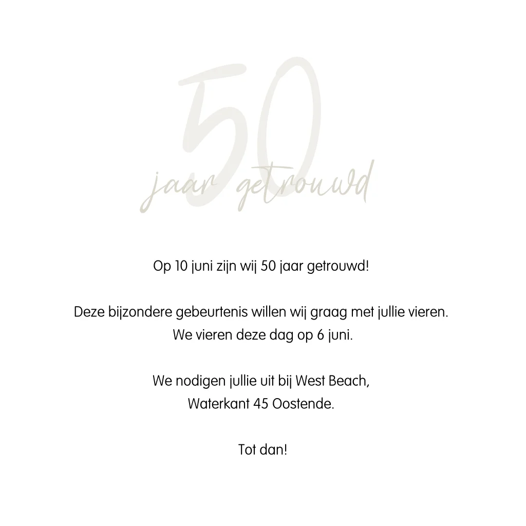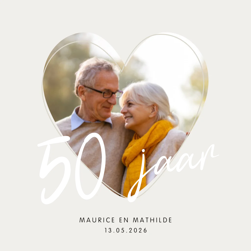 Romantische uitnodigingskaart voor een vijftigjarig huwelijksfeest. Op de voorkant kan een eigen foto worden geplaatst in het hartvormige kader, 50 jaar staat in goudfolie over de foto, dat geeft een feestelijk accent. Upload een leuke foto in de online editor en pas de teksten naar wens aan, mooi in een zandkleurige enveloppe met gouden inlay!
