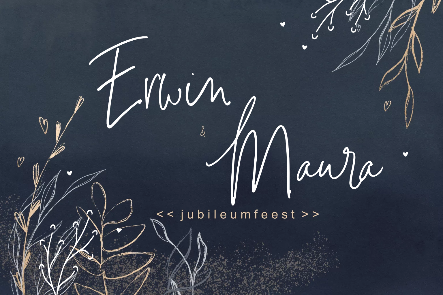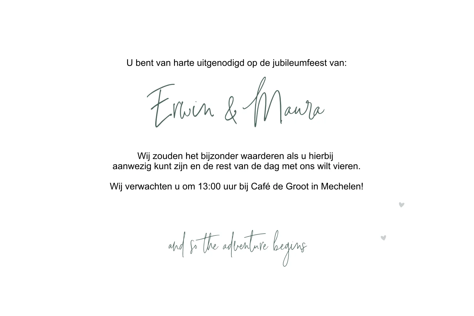 Stijlvolle en moderne uitnodiging voor het feest ter ere van jullie huwelijksjubileum. In de hoeken staan getekende takjes en hartjes, de namen staan in een trendy lettertype. Door de zilverfolie krijgt de kaart een luxe uitstraling. In de online editor maak je de kaart persoonlijk, daar kies je ook lettertypes en kleuren.