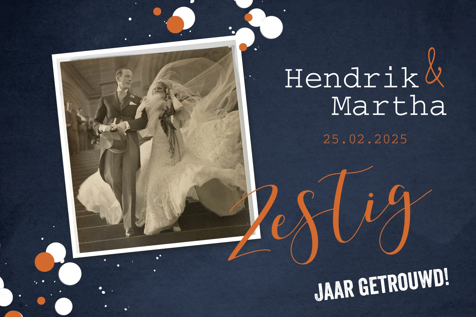 Moderne uitnodiging voor het feest ter ere van jullie 60-jarig huwelijk. Om de foto staat confetti in oranje en wit, deze kleuren komen terug op de rest van de donkerblauwe kaart. In de online editor kun je een mooie foto van het bruidspaar uploaden en teksten aanpassen naar eigen wens.