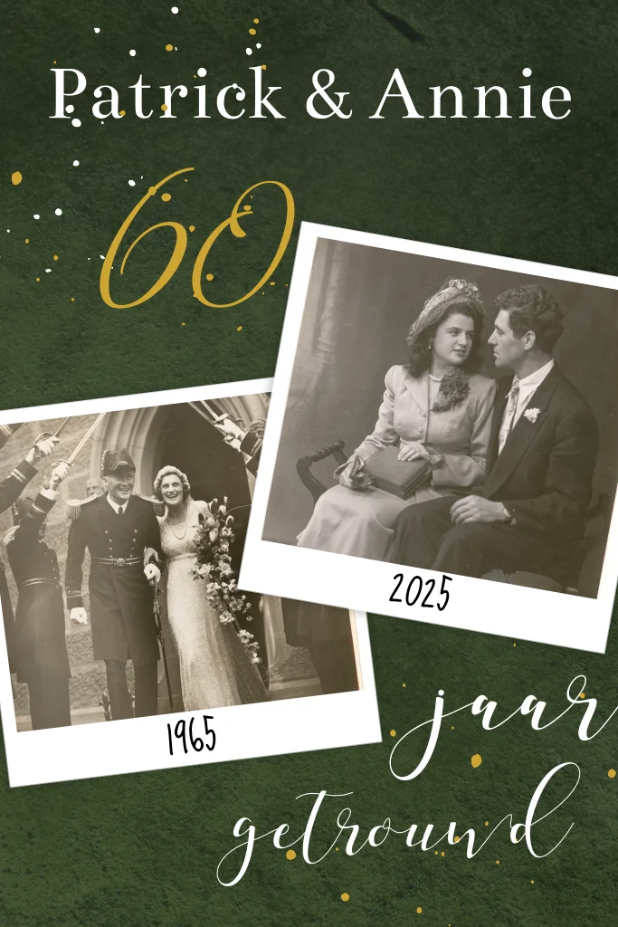 Zestig jaar getrouwd, wat een mijlpaal! Laat vrienden en familie met deze stijlvolle kaart weten dat jullie deze bijzondere gebeurtenis graag met ze willen delen. In de witte kaders op de voor- en achterzijde kun je zelf leuke foto's toevoegen van toen en nu. De confetti en het sierlijke lettertype maakt de kaart compleet. Je kunt kleuren, teksten en afbeeldingen zelf aanpassen in de online ontwerptool. Zo gedaan!