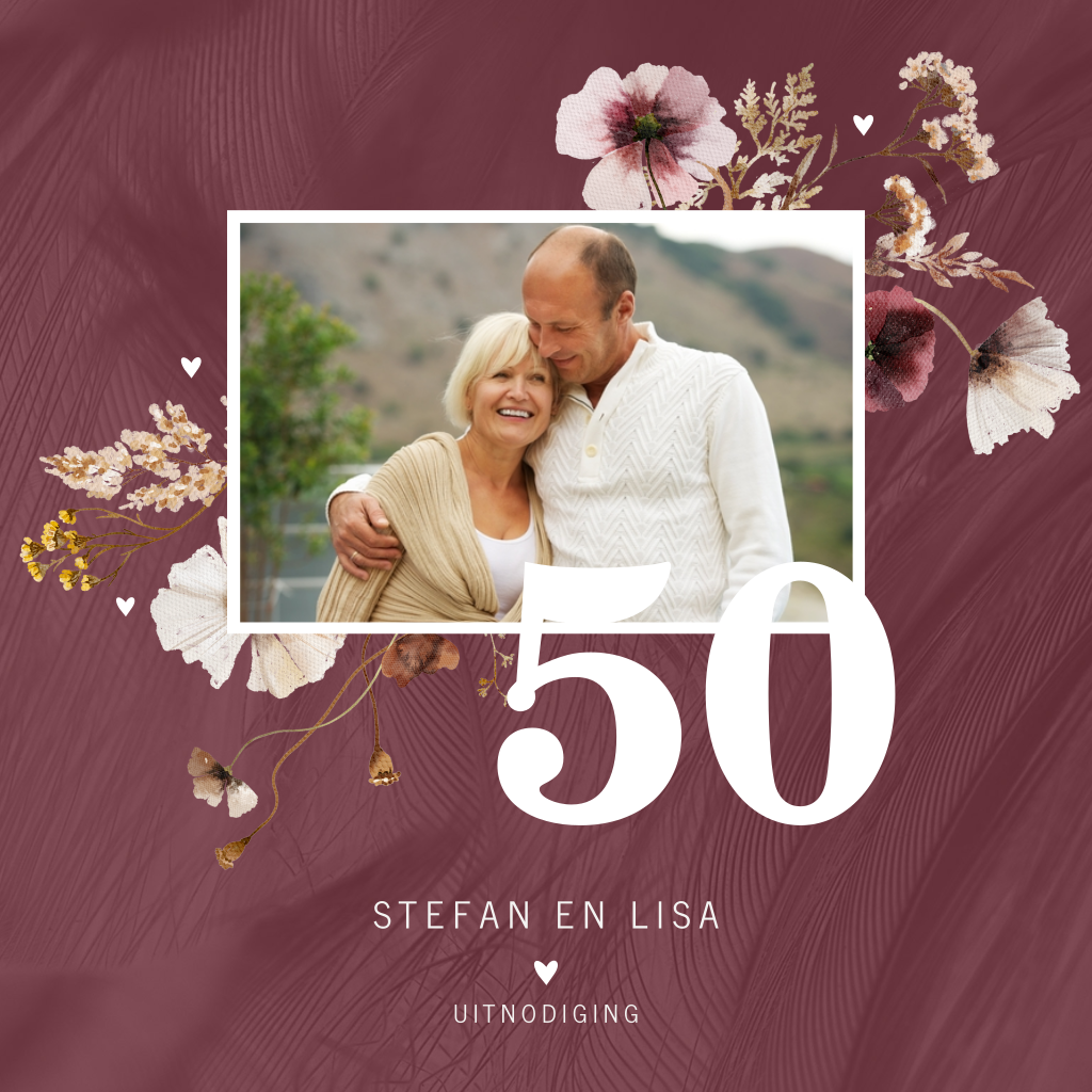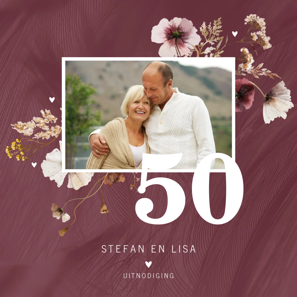 Stijlvolle uitnodiging voor een 50-jarig huwelijksfeest, met ruimte voor het plaatsen van een eigen foto. De kaart is in donkerrood aubergine met een bloemenpatroon er omheen. Eronder staat de vijftig in goudfoliedruk, bij de namen staat een klein hartje. De binnenzijde is wit met het bloemendesign, upload een leuke foto en pas de tekst eenvoudig zelf aan in de online editor.
