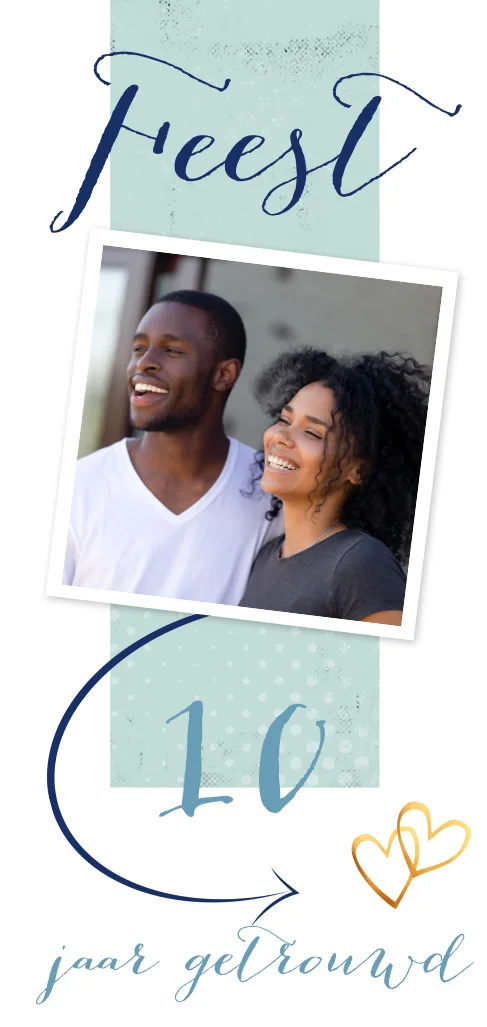Deze langwerpige enkele kaart is een stijlvolle uitnodiging voor een feestje ter ere van jullie huwelijksjubileum. In het midden jullie mooiste foto op een lichtblauw kleurvlak en bijpassende typografie. Liever toch een andere kleur of lettertype? In de online editor kun je dit zelf aanpassen. Zo gedaan!