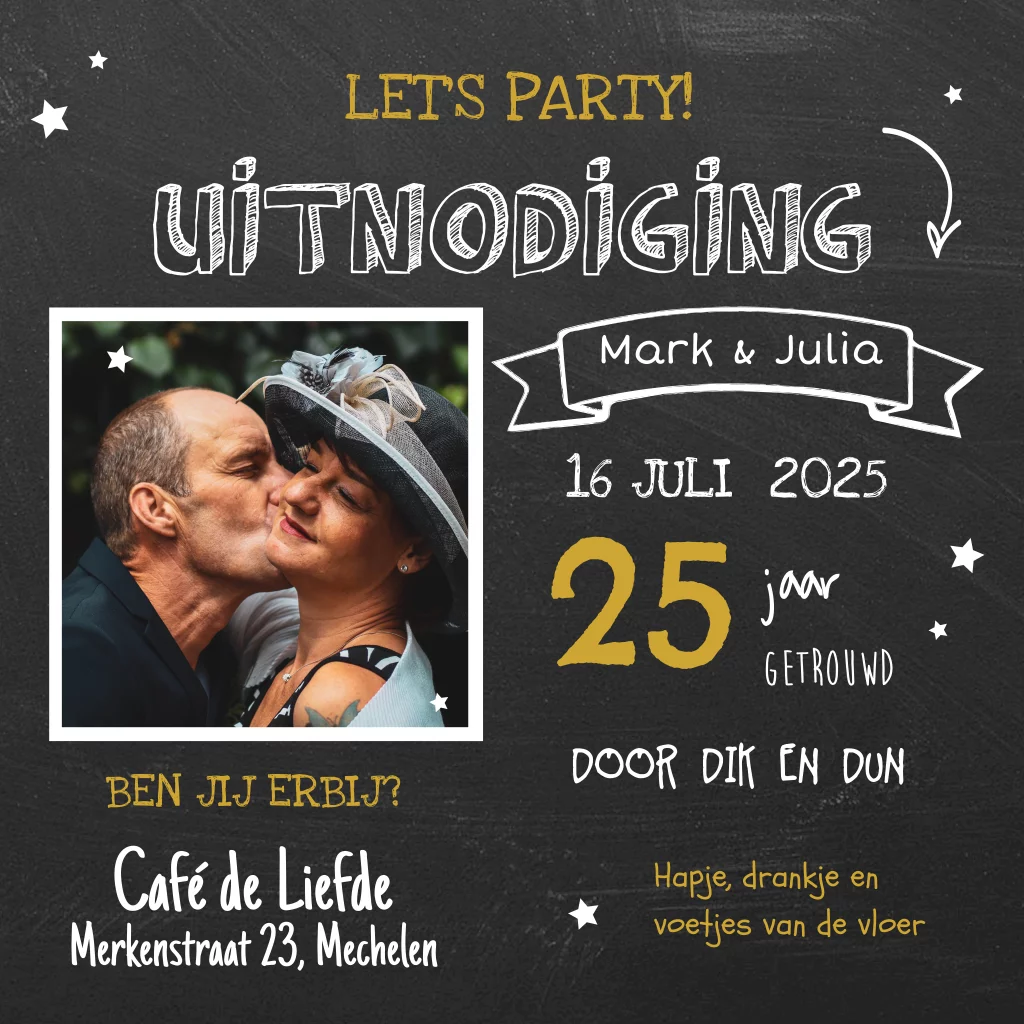 Een stoere en feestelijke uitnodiging voor een 25-jarig huwelijksjubileum. Op de krijtbord-look achtergrond staan tekst in verschillende lettertypes en symbolen in de stijl van handlettering. Upload jullie mooiste foto en voeg eigen tekst toe in de online editor, zo ontwerp je een persoonlijk kaartje!