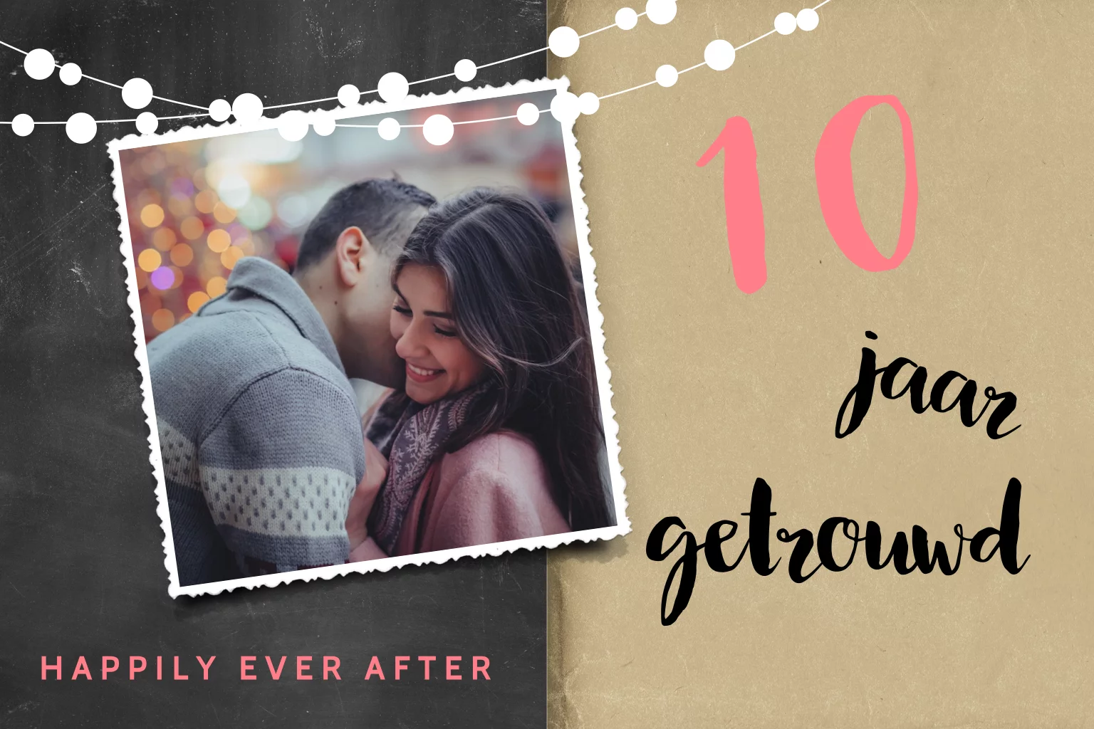 Een trendy trouwkaart voor een 10-jarig huwelijk, waarop je zelf een foto kunt zetten. De achtergrond is verdeeld in krijtbord- en kraftlook. De lichtslinger over de foto heen geeft een romantisch effect.
