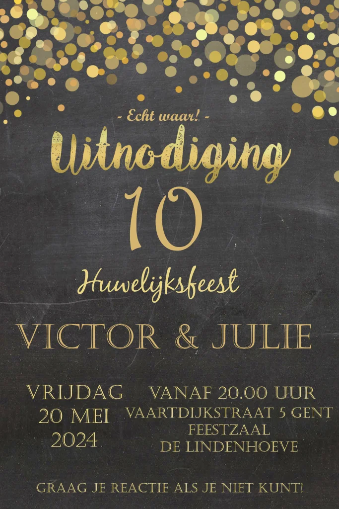 Uitnodigingskaart voor het feest ter ere van jullie 10-jarig huwelijksjubileum. Met de sierlijke gouden letters en stipjes op een zwarte krijtbordlook achtergrond ziet deze kaart er sfeervol uit.