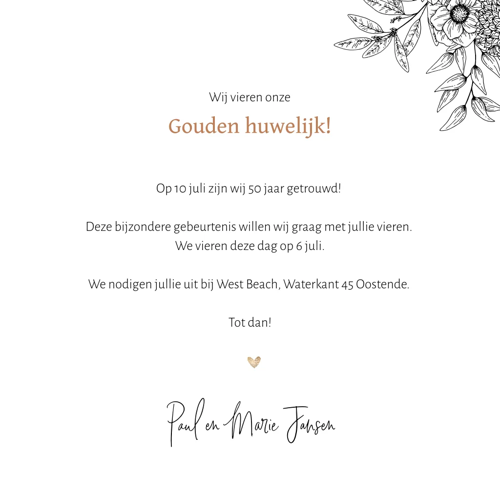 Uitnodiging 50 jaar huwelijk met foto en bloemen in lijntekening