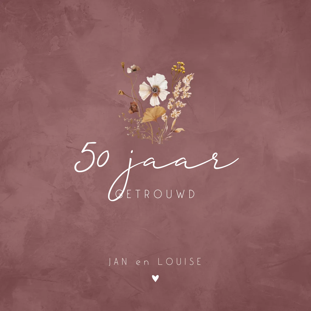 Stijlvolle uitnodigingskaart voor een jubileum huwelijksfeest, de buitenkant van de kaart is in oudroze velvet-look, de binnenzijde is wit. Op de voorkant staat een bloemenafbeelding, '50 jaar' staat in luxe goudfolie, het bloemendesign komt ook aan de binnenzijde weer terug. Pas de kaart naar wens aan in de online editor.