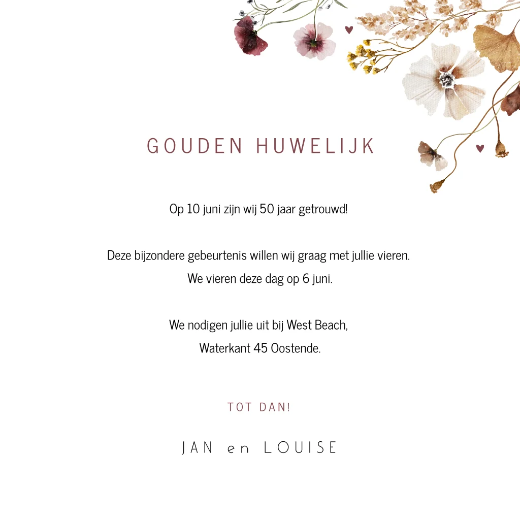 Uitnodiging 50 jaar huwelijk met goudfolie en bloemen op velvet-look