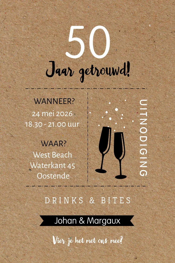 Nodig familie en vrienden uit voor jullie vijftigjarig huwelijksfeest met deze stoere uitnodiging in kraftlook. Er zijn verschillende lettertypes gebruikt in zwart en wit en met leuke icoontjes zoals de champagneglazen maak je er een speels geheel van. In de online editor maak je de kaart helemaal naar eigen wens.