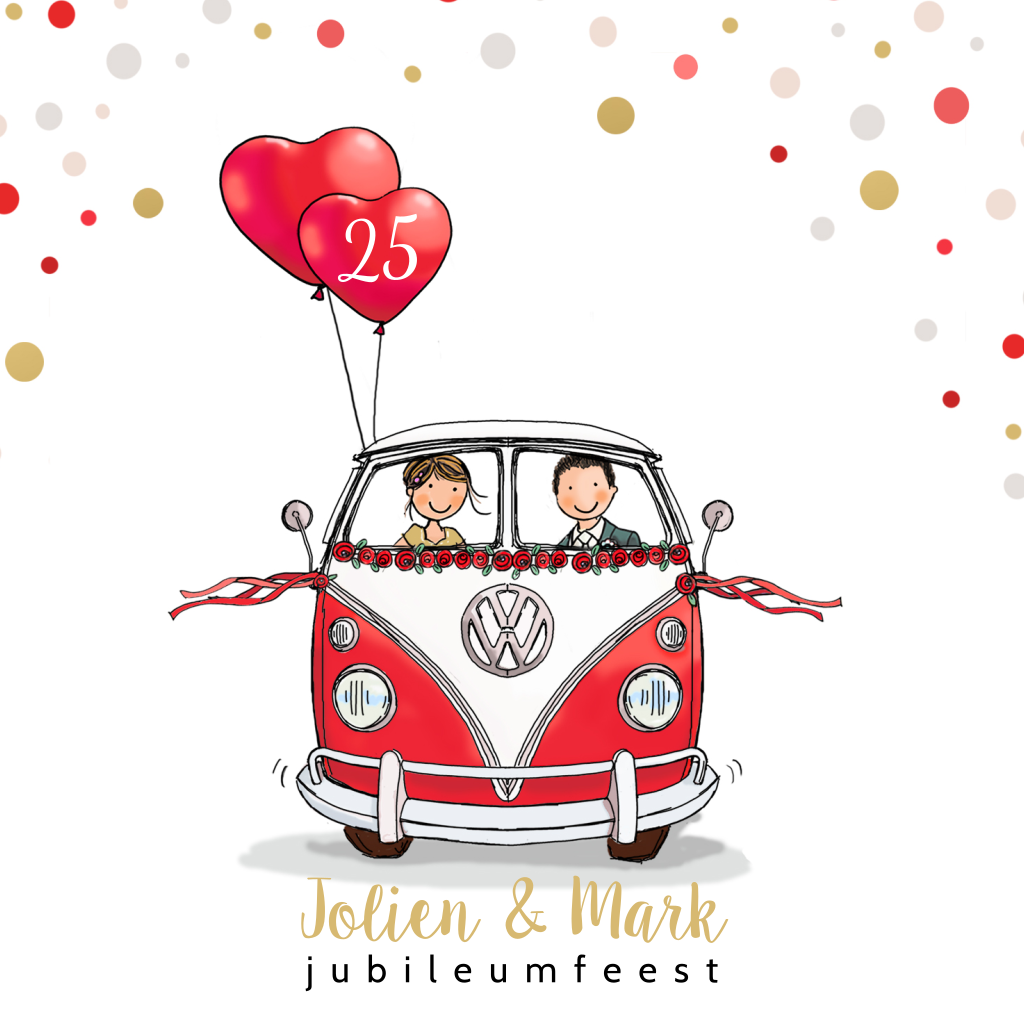 Hippe uitnodigingskaart voor jullie 25-jarige trouwdag. Met het rode volkswagenbusje, de hartjesballonnen en gekleurde confetti is deze jubileumkaart een feestje om te versturen. In de online editor pas je het kaartje naar eigen wens aan.