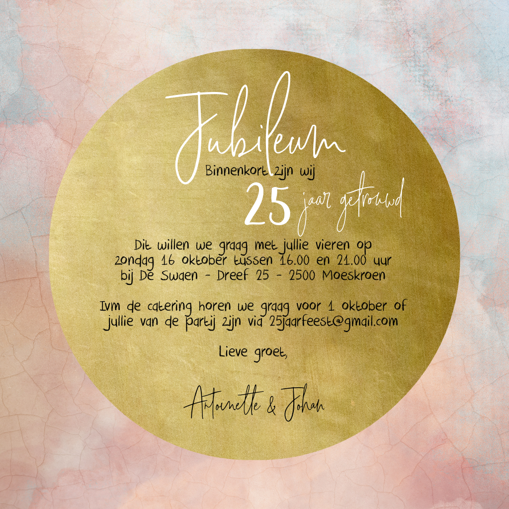 Stijlvolle uitnodiging voor een jubileumfeest. De kaart is rijk gedecoreerd met prachtige bloemen in roze en oranje op een blauw met roze watercolour achtergrond. Ook de binnenzijde en de achterkant zijn in dezelfde stijl. In de cirkel aan de binnenkant is ruimte voor een mooie foto. De kaart is eenvoudig zelf aan te passen in de online editor.