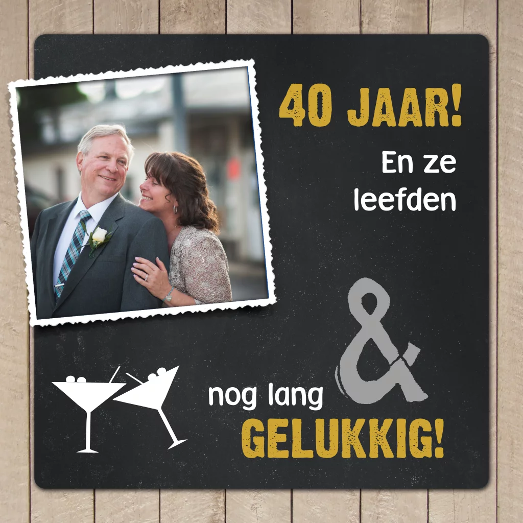 Jubileumkaart voor jullie 40-jarig huwelijksfeest. Met een krijtbord op houten achtergrond, cocktailglazen en ruimte om je eigen foto toe te voegen een stoere kaart om jullie gasten uit te nodigen.