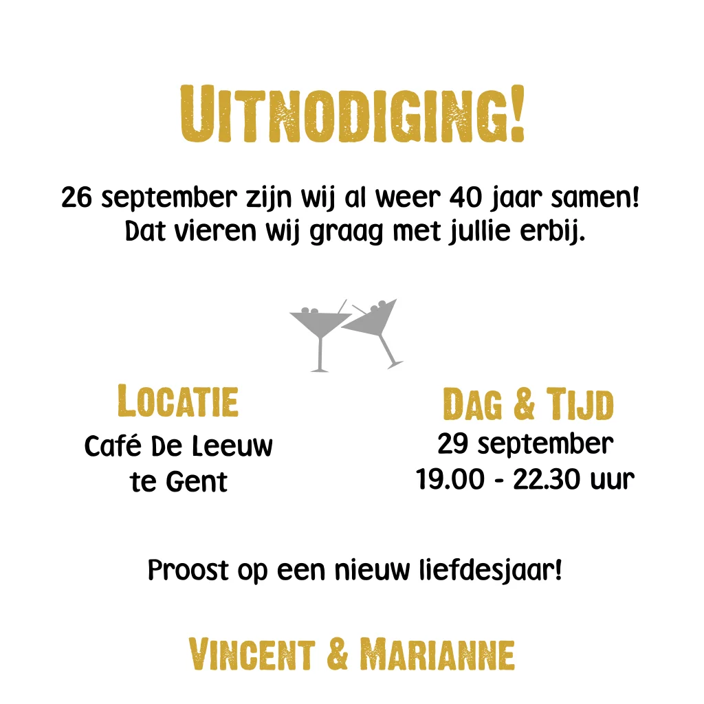Uitnodiging jubileum 40 jaar met cocktail glazen, krijtbord en hout