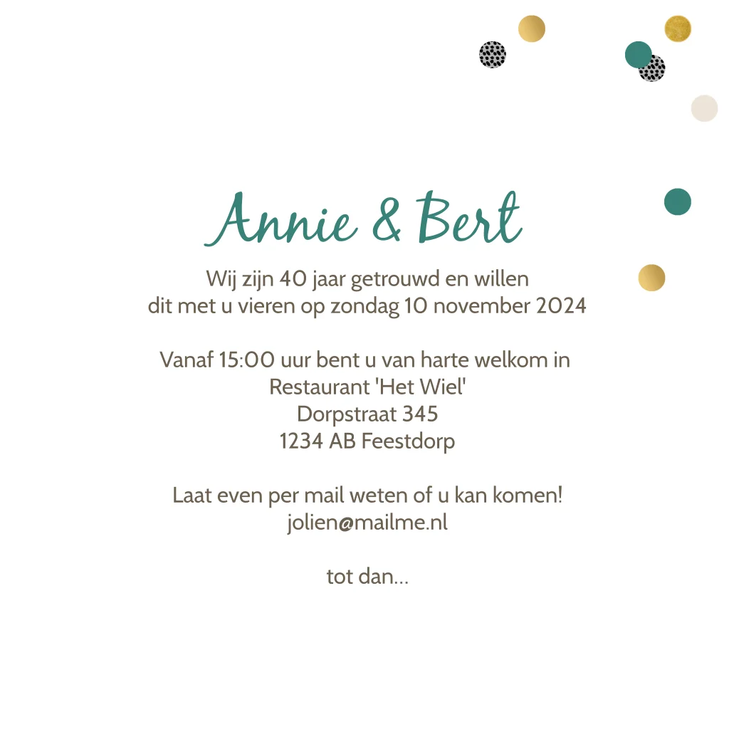 Jubileum uitnodiging met goudlook en confetti voor 40 jaar getrouwd