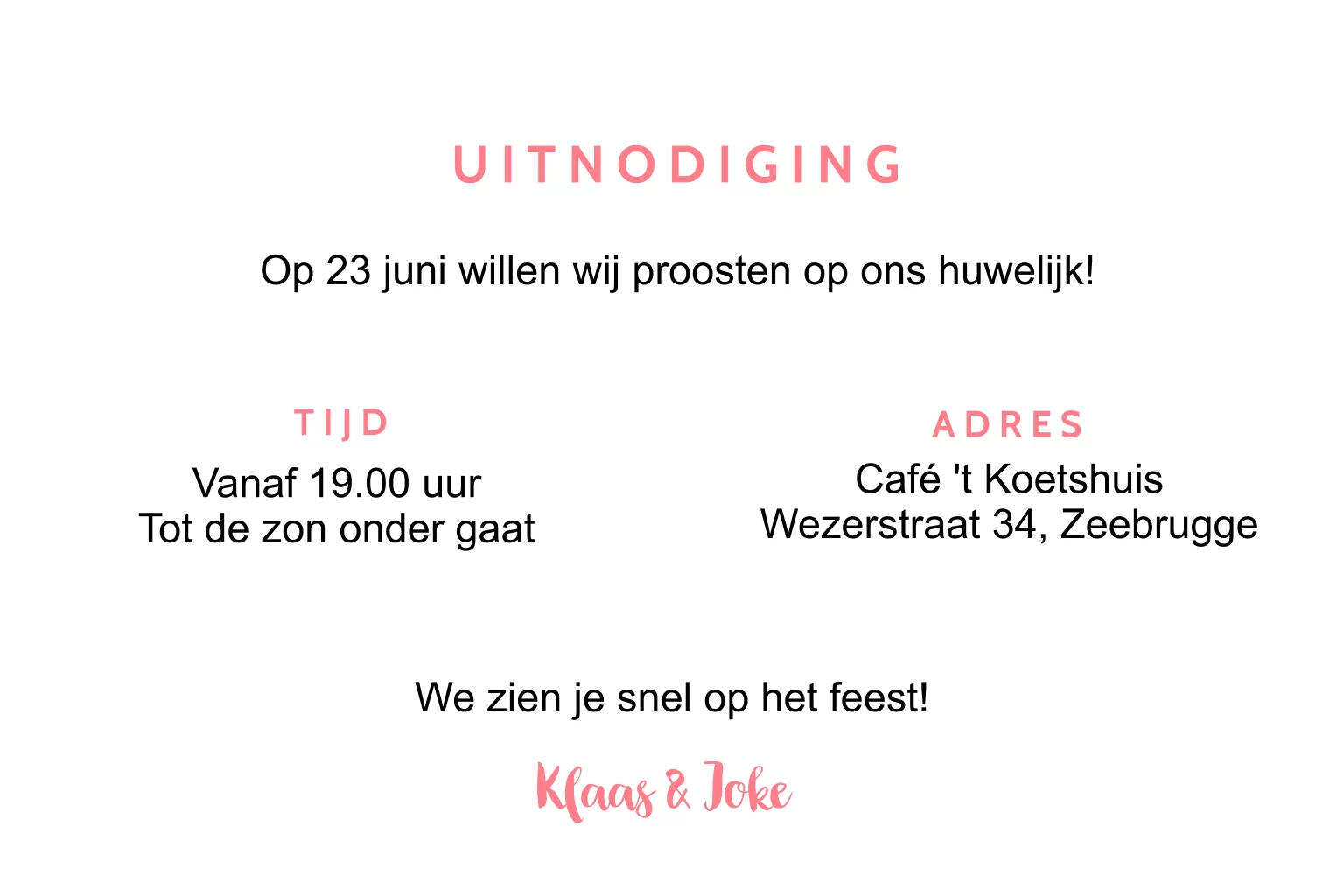 Vrolijke uitnodiging in kraftlook voor het feest ter ere van jullie 40-jarig huwelijk. Op het zwarte vlak is ruimte voor jullie mooiste foto, erboven staat een feestelijke slinger. De tekst is in roze en zwart in een trendy lettertype, liever een ander lettertype? In de online editor pas je dit eenvoudig aan naar wens en maak je de kaart persoonlijk met eigen tekst. Zo gedaan!