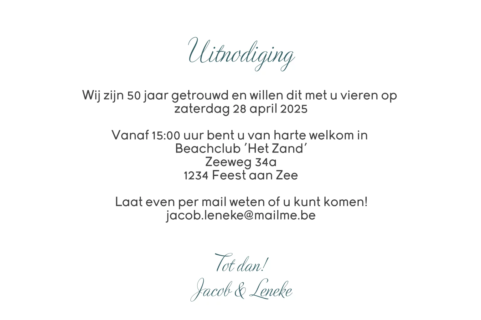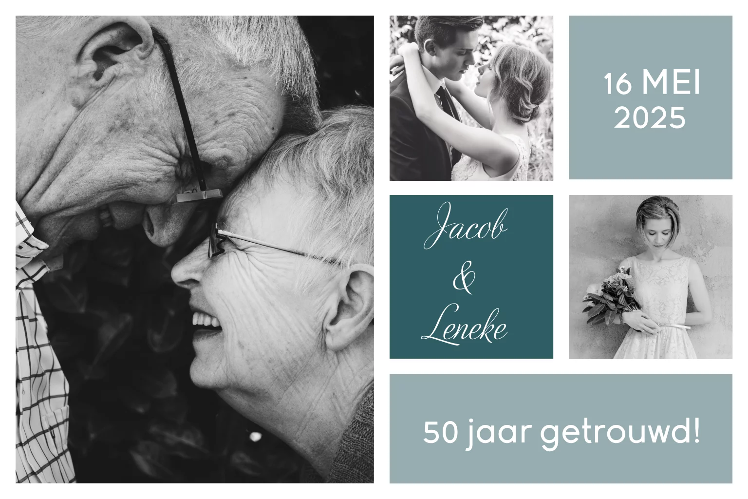 Een stijlvolle uitnodigingskaart voor het feest ter ere van jullie 50-jarig huwelijksjubileum. De kaart is verdeeld in verschillende vlakken met foto's en tekst. De vlakken met tekst zijn blauw met witte typografie. Liever andere kleuren? In de online editor kun je kleuren, tekst en lettertypes zelf aanpassen en zo jullie persoonlijke uitnodiging maken.