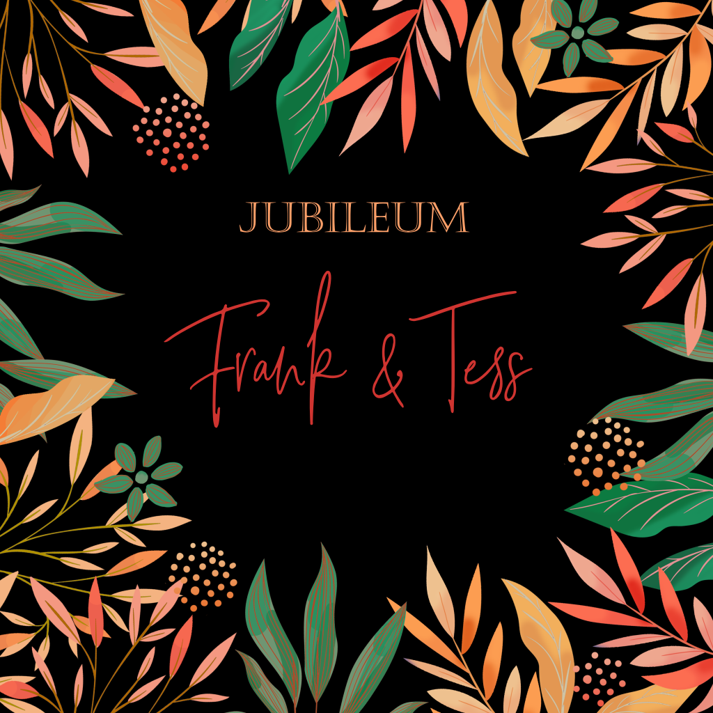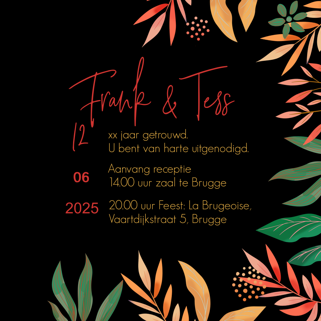 Een vrolijke jubileumkaart met een design van verschillende takjes in rood, oranje en groen op een zwarte achtergrond. Aan de binnenkant van de kaart kun je een persoonlijke tekst schrijven in een hip lettertype, maak de kaart af in de online editor.
