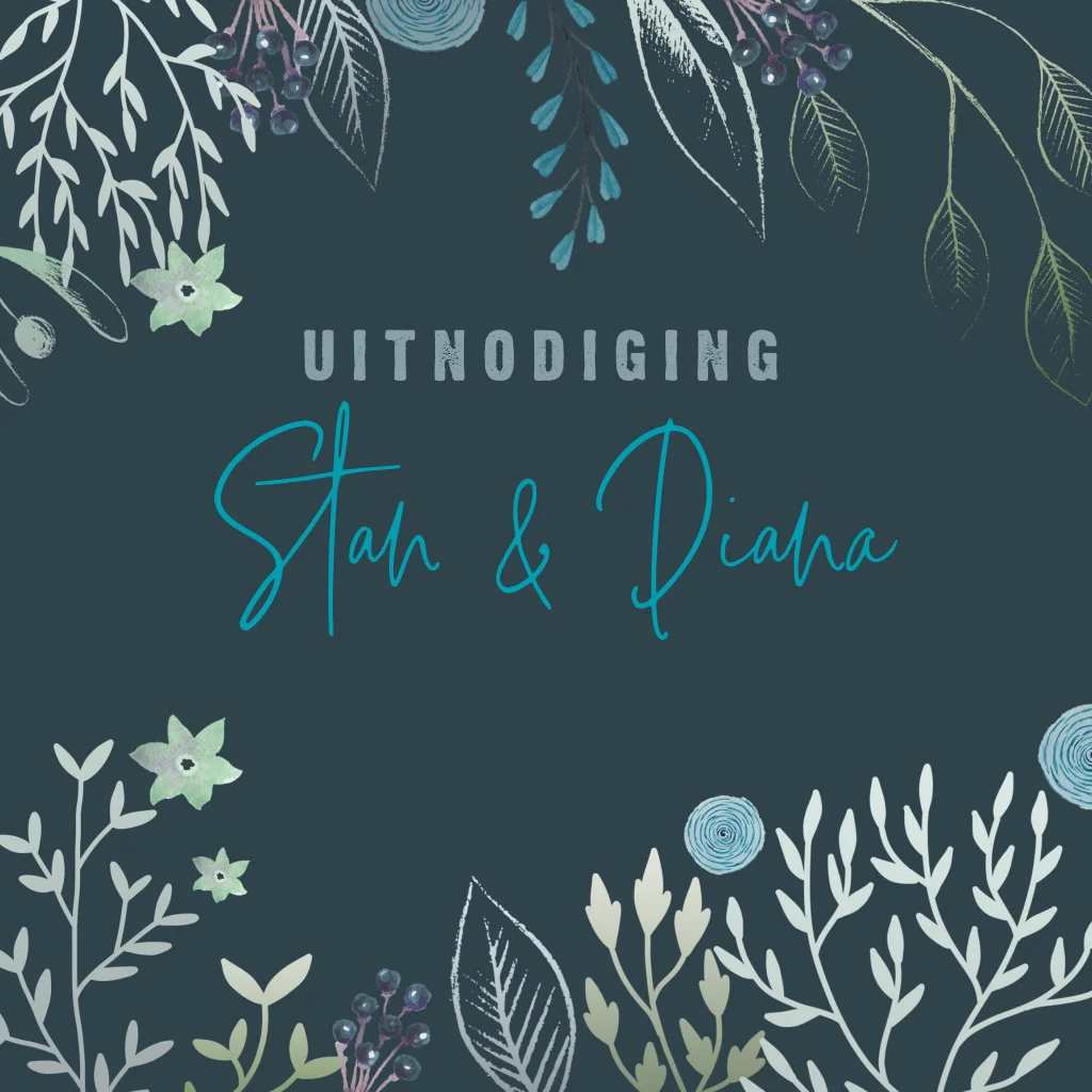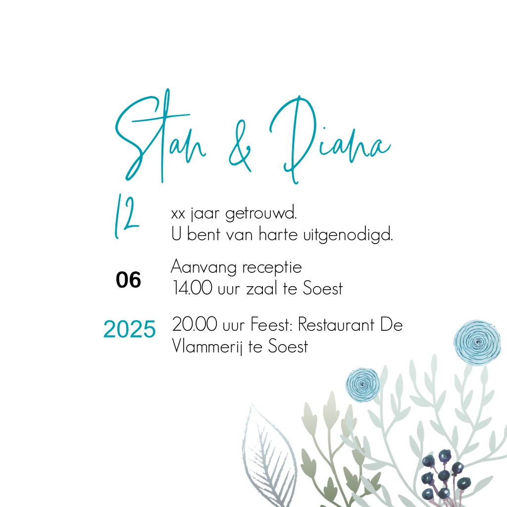 Feestelijke uitnodiging voor een huwelijksjubileum met tekening van botanische takken, bladeren en bloemetjes. Verander de achtergrondkleur, de teksten en lettertypes en ontwerp zo je eigen unieke kaart!