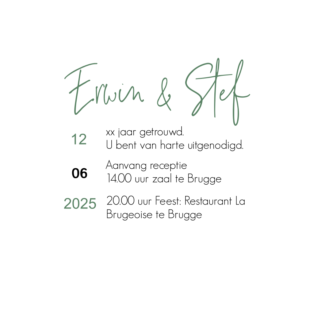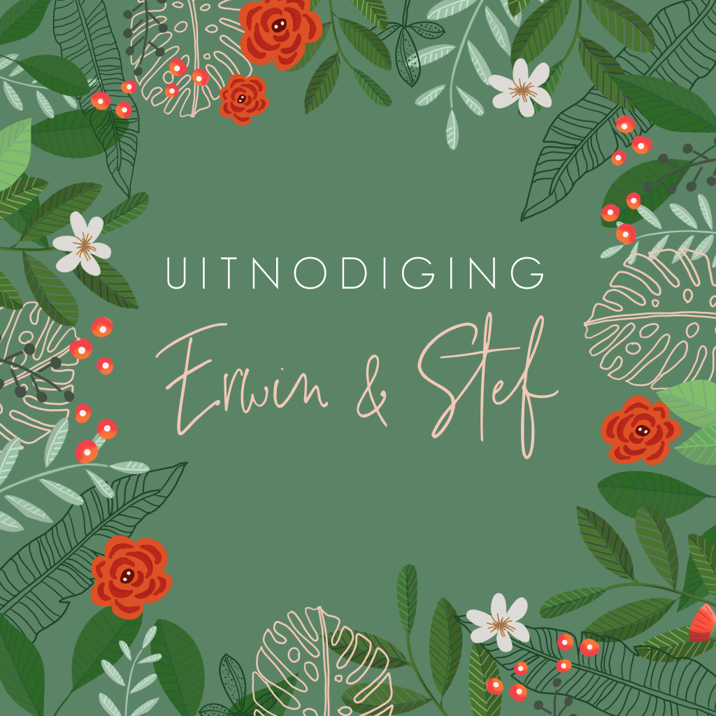Een vrolijke uitnodiging voor jullie jubileumfeest in botanische stijl. Op de groene ondergrond staan bloeiende takjes in rood, groen en wit, een leuke kaart voor jullie feestje in het voorjaar! In de online editor voeg je eenvoudig eigen teksten toe.