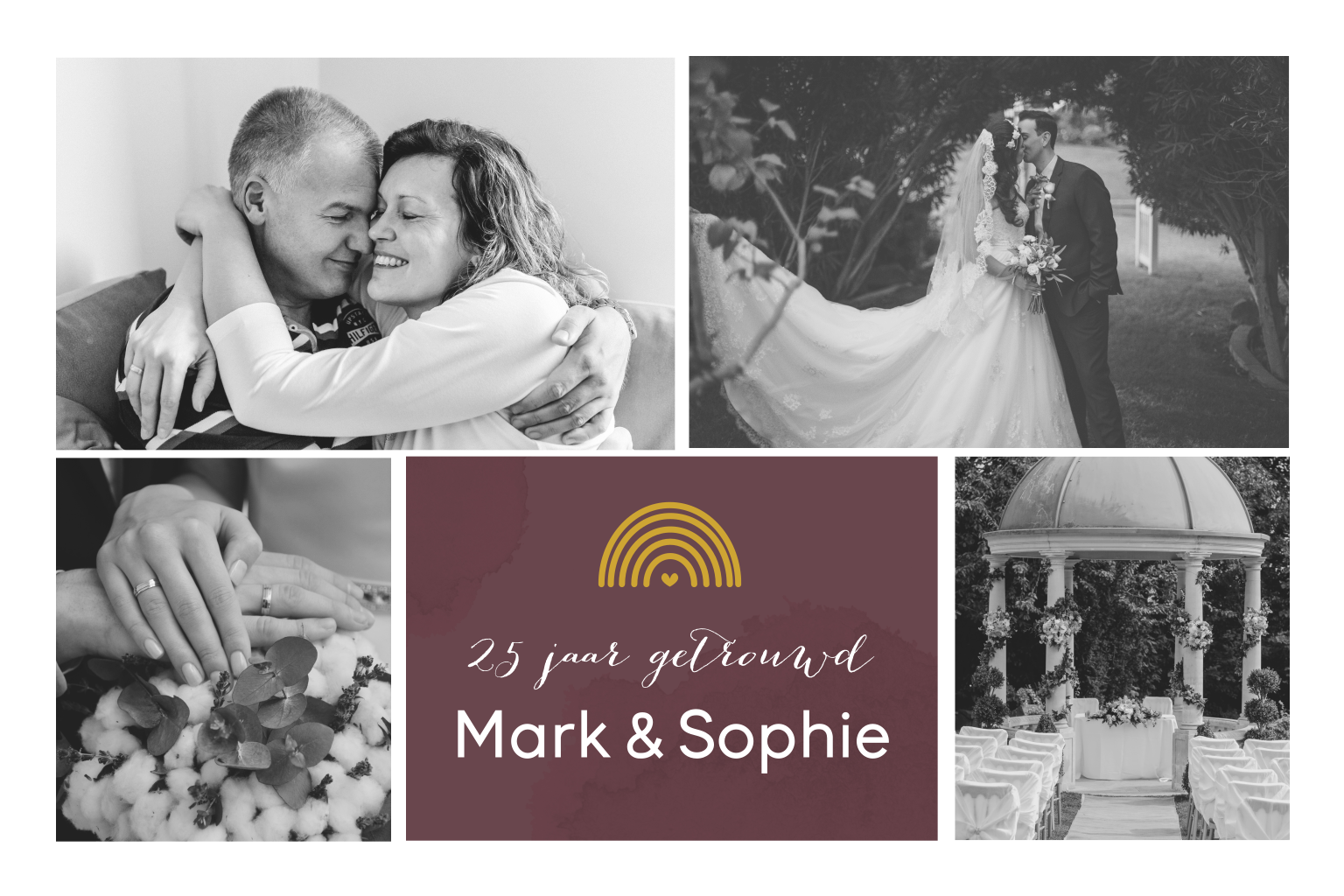 Op deze jubileumkaart kunnen vier foto's worden gezet. Op de voor- en achterkant staan auberginekleurige vlakken met een goudkleurig regenboogje. In de online editor maak je de kaart helemaal persoonlijk, hier kies je ook kleuren en lettertypes.