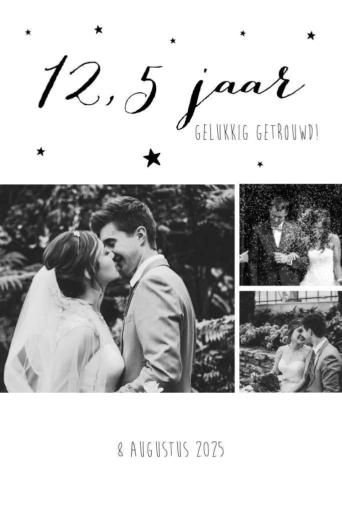 Uitnodiging voor een jubileum met zwart-wit foto's en trendy typografie. Pas de kaart geheel naar wens aan door de foto's te vervangen en kleuren aan te passen in de editor.