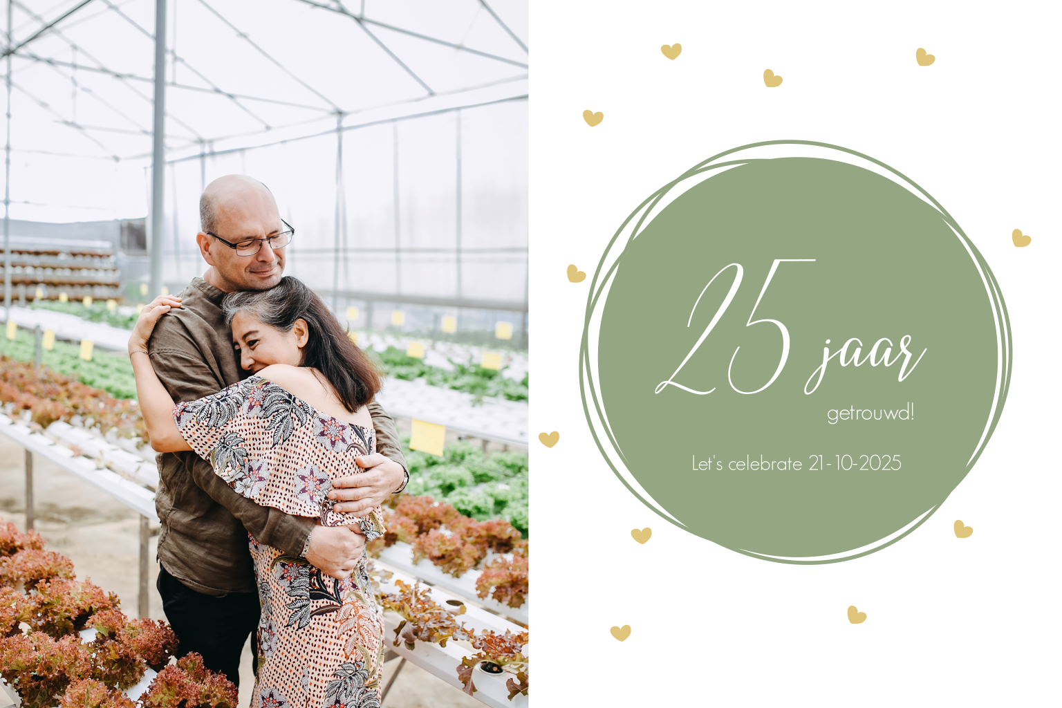 Een vrolijke uitnodiging voor jullie jubileumfeestje. Op de ene helft is ruimte om een eigen foto te uploaden. Op de andere helft een tekstcirkel in olijfgroen, op een achtergrond van een wit vlak met kleine hartjes. In onze online editor kun je de kaart volledig naar wens aanpassen. Hier vindt je verschillende kleuren voor de achtergrond en allerlei lettertypes.