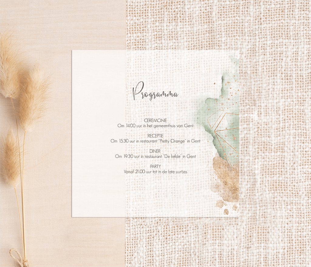 Stijlvol inlegvel van kalkpapier met een abstract vlak waterverf in groen en goudgeel. Over de aquarel staan goudkleurige spetters en geometrische lijnen.