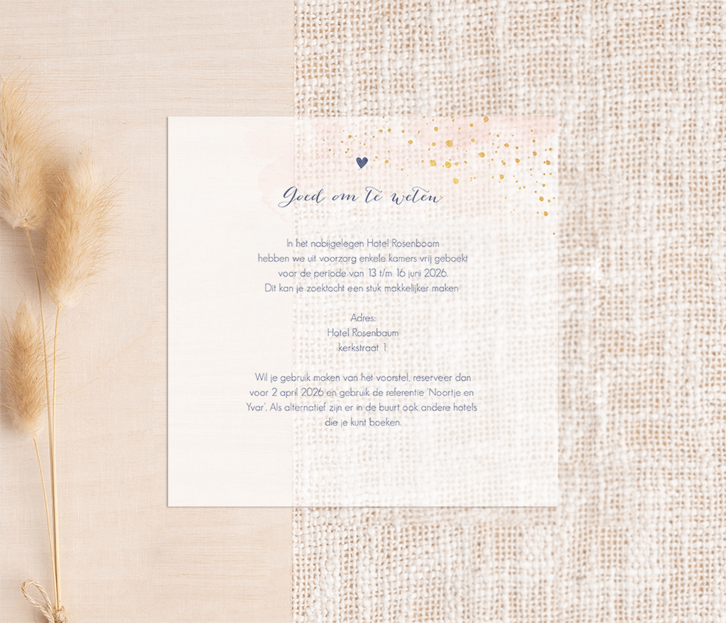 Mooi inlegvel met roze waterverf en goudkleurige spetters in de hoek. De tekst is in donkerblauw met een hartje erboven. Goed om te weten: