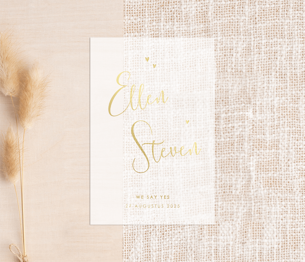 Voorblad van kalkpapier voor een trouwkaart, met de namen van het bruidspaar en hartjes in goudfolie.