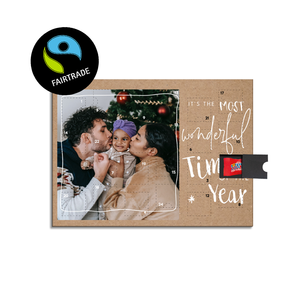 Leuke adventskalender in kraftlook met ruimte voor een grote foto, de tekst is in wit, maak de kalender naar wens in de online editor.
