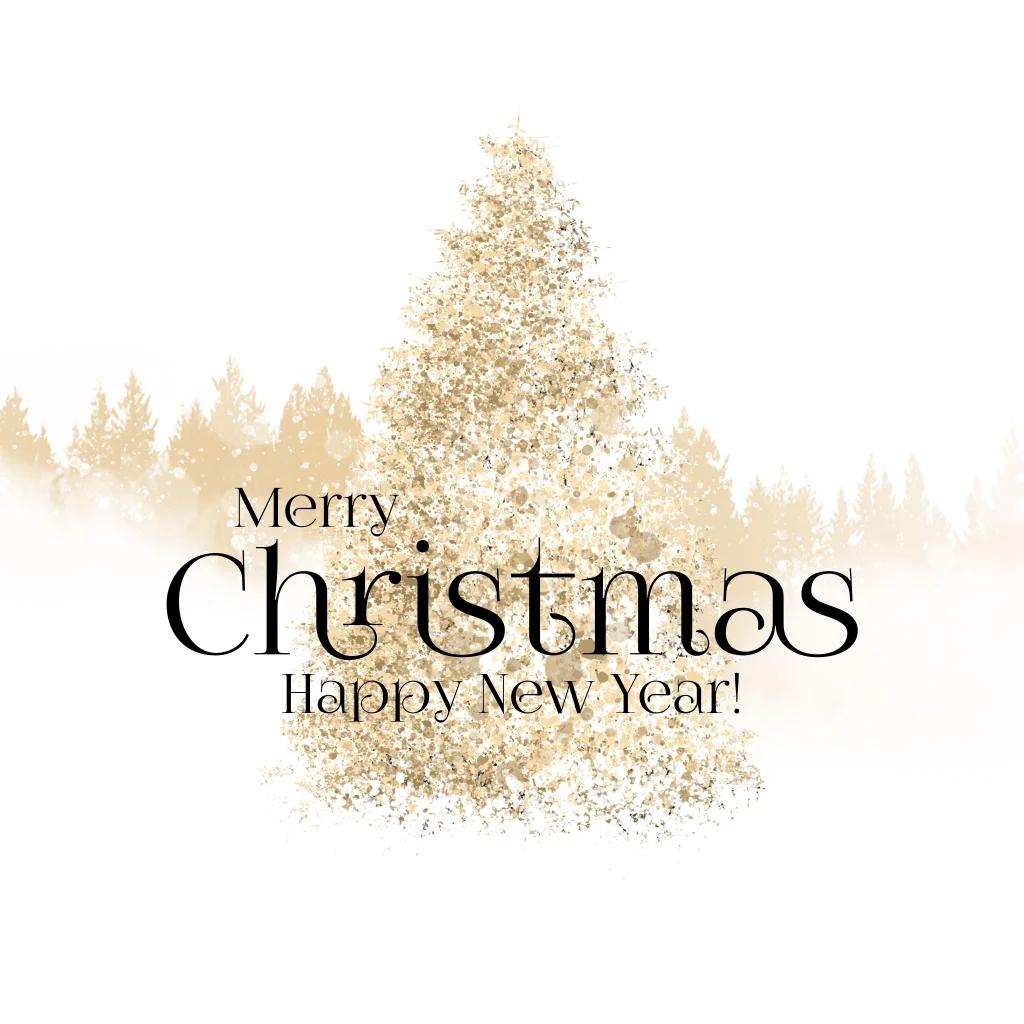 Een mooi winters kerstkaartje met gouden kerstboom en bos op de achtergrond. Een mooie zakelijke kerstkaart om collega's of zaken relaties te bedanken voor het afgelopen jaar en het beste te wensen voor het nieuwe jaar.