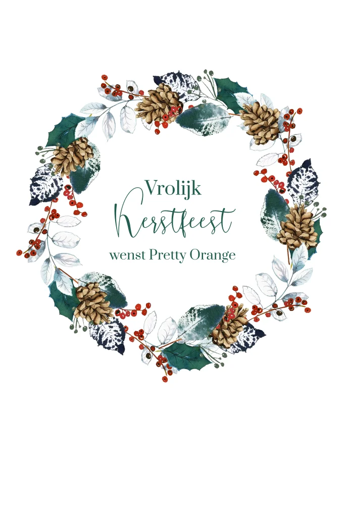 Klassieke kerstkaart in wit met een krans in rood en groen met dennenappels. Ontwerp de kaart verder naar wens in de online editor.