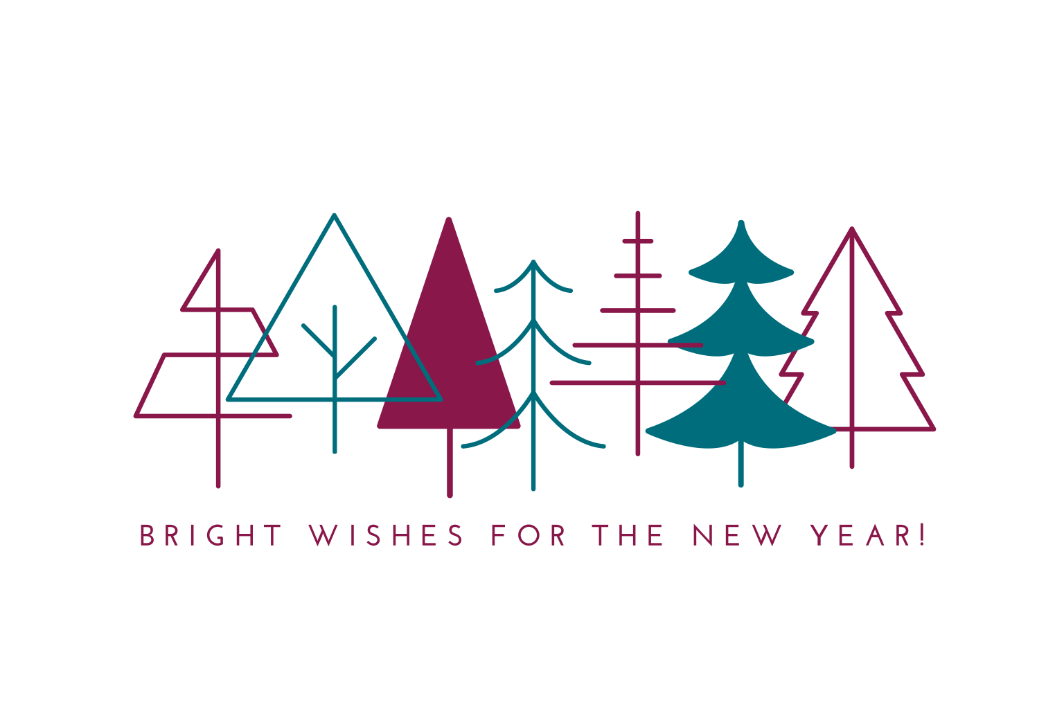 Zakelijke kerstkaart met moderne kerstbomen in fuchsia en petrol op een witte achtergrond. Voeg uw eigen teksten aan dit kaartje toe in de online editor.
