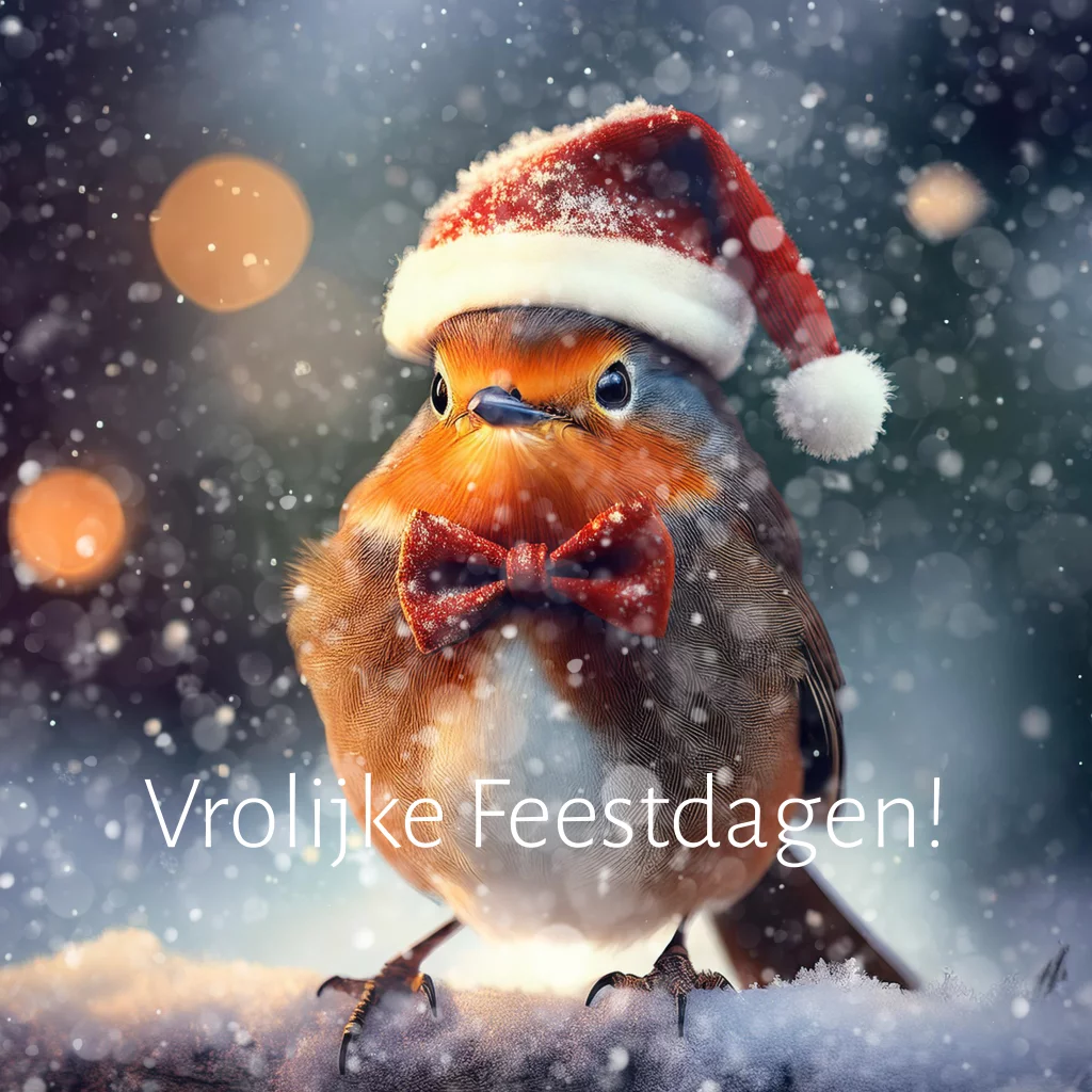 Een vrolijk kerstkaartje met een roodborstje in de sneeuw. Zakelijke kerstkaart voor collega's of zakenrelaties.