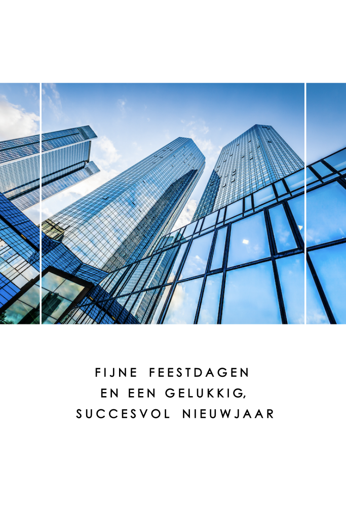 Zakelijke kerstkaart met foto en goudfolie kader en strakke moderne letters.