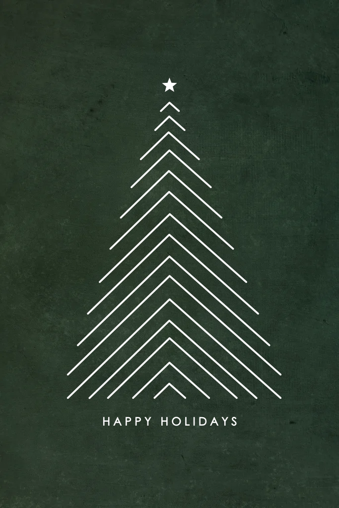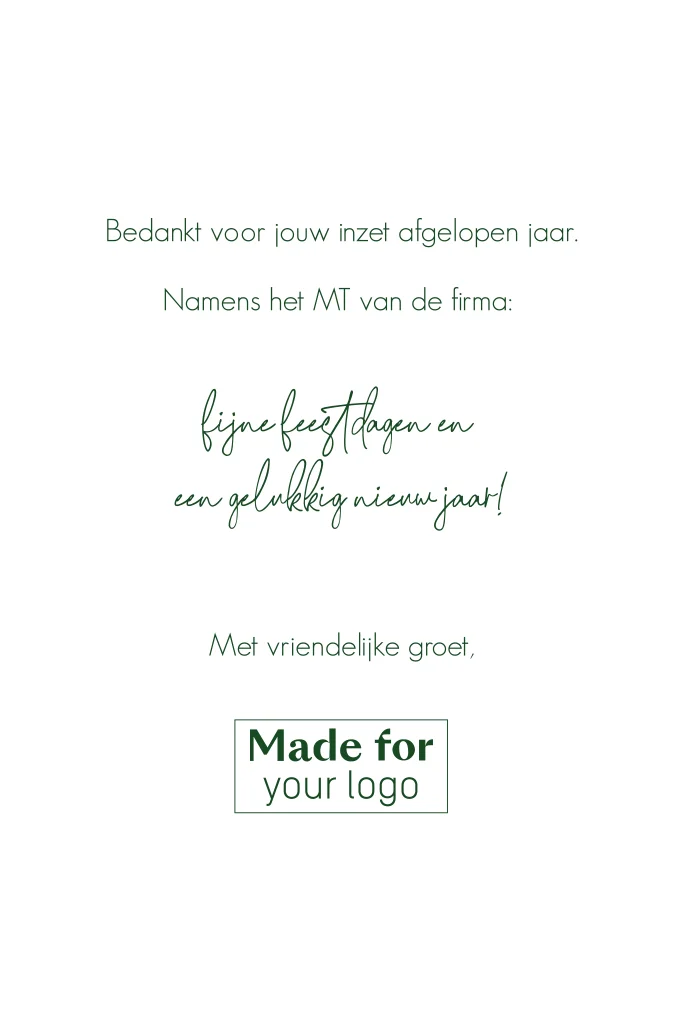 Een zakelijke kerstkaart met een abstracte kerstboom van goudfolie. Aan de binnenkant is ruimte voor een eigen foto. De kaart is eenvoudig aan te passen in de online editor.