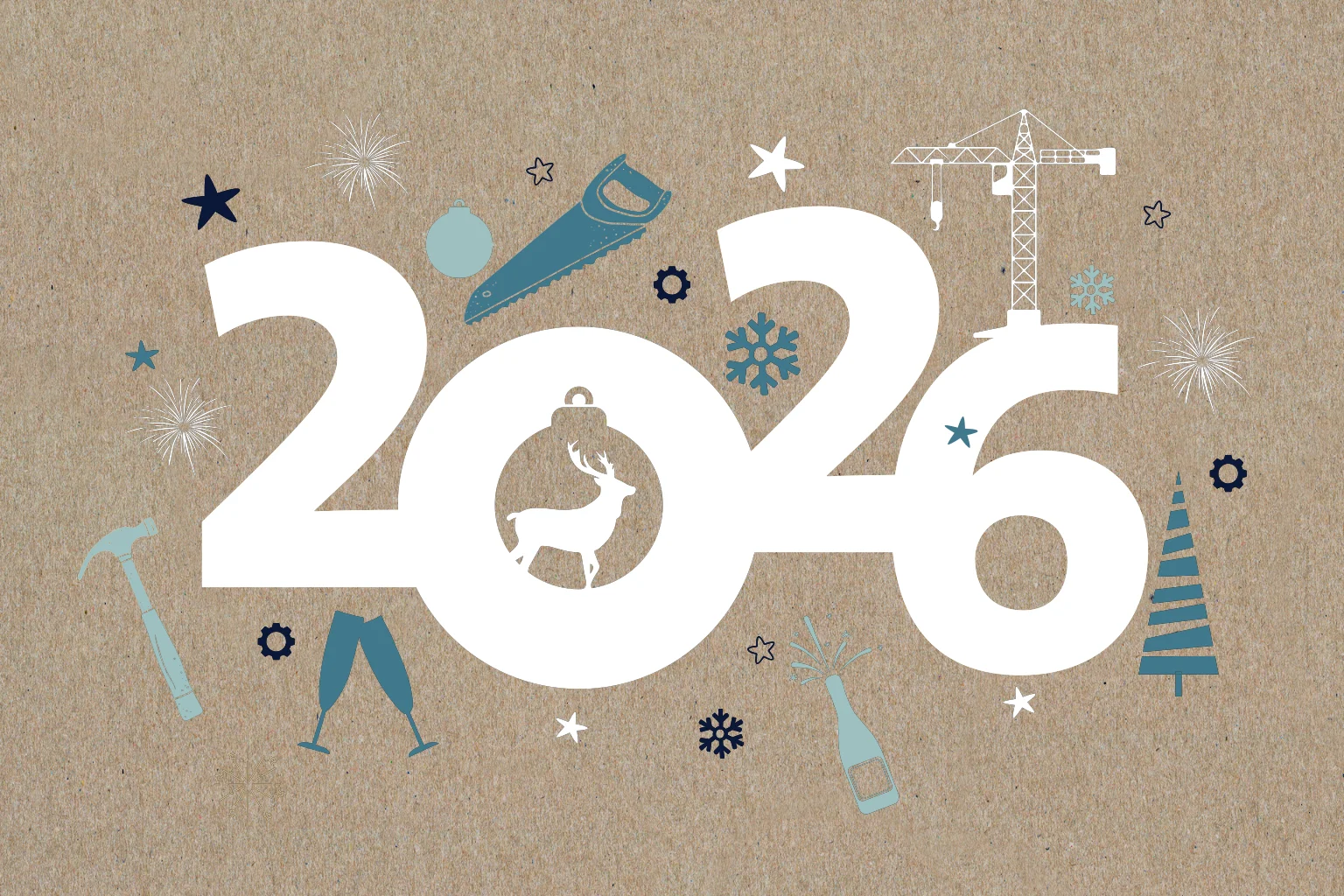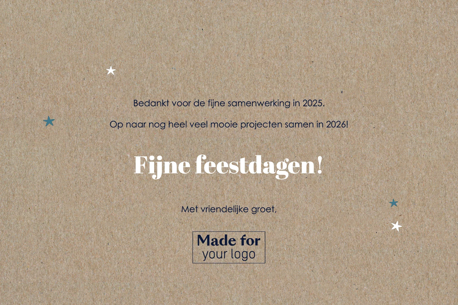 Een zakelijke kerstkaart van echte kraft in bouwthema met klusgereedschap, met daartussen kerstelementjes.