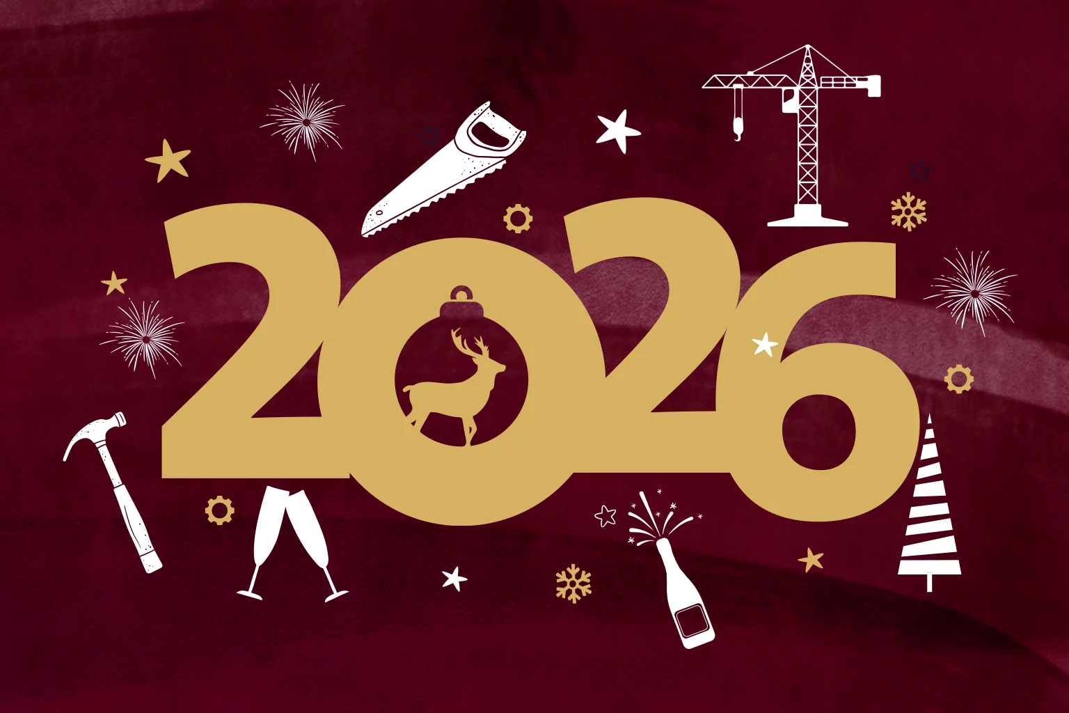 Donkerrode kerstkaart met tekeningen van bouwkraan, zaag en hamer met op de achtergrond vuurwerk, sterren, kerstboom en champagne met glazen. Goudkleurige typografie met rendier.