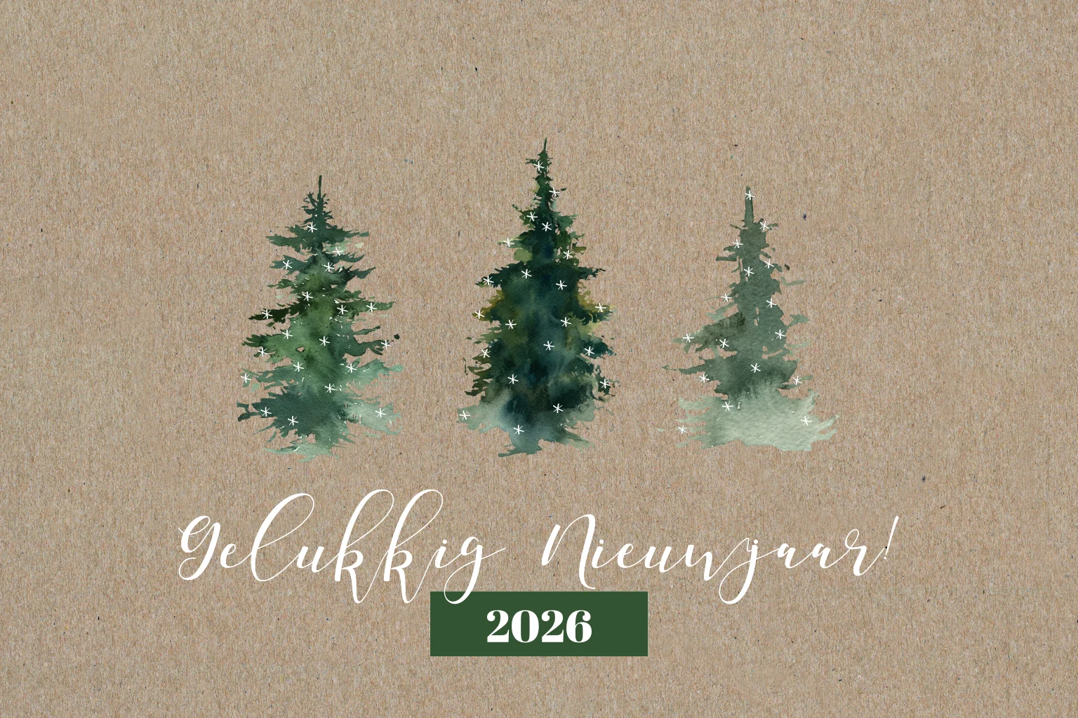 Stuur een mooie zakelijke kerstkaart en wens uw collega's en klanten een vrolijk kerstfeest. Op deze kaart van echt kraftpapier staan dennenbomen in aquarel, op de achterkant is ruimte om een eigen foto toe te voegen. Maak de kaart naar wens af in de online editor.