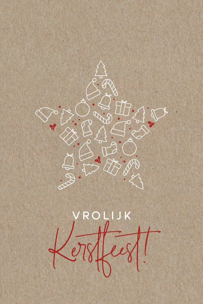 Mooie kerstkaart van echt kraftpapier met een witte ster die bestaat uit getekende witte kerstillustraties. Ertussen staan rode hartjes en de tekst is in bijpassend rood. Pas de kaart naar wens aan in de online editor.