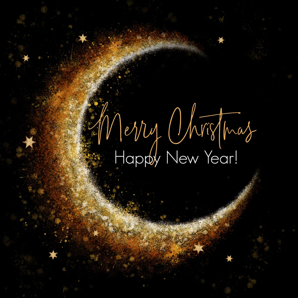Een warme sfeervolle kerstkaart met gouden maan en sterren. De tekst is in bijpassende goudkleur, pas deze eenvoudig zelf aan in de online editor.
