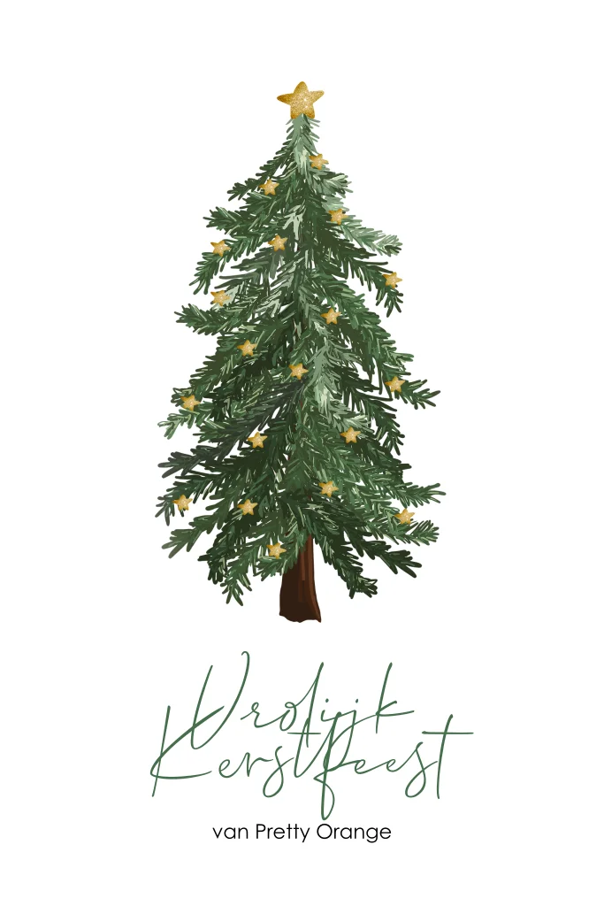 Mooie kerstkaart met een illustratie van een groene dennenboom met verlichting en een ster in de top.