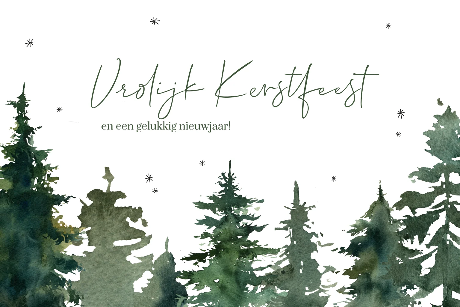 Stijlvolle kerstkaart met een mooie waterverftekening van kerstbomen en sterretjes erboven. De aquarel dennenbomen komen ook aan de achterzijde weer terug.