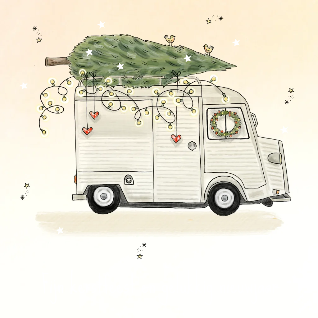 Grappig getekende vierkante kerstkaart op wit papier met aquarel en tekening. Bovenop het Citroën-busje ligt een kerstboom met lichtjes en hartjes, op de achtergrond kleine sterretjes. De tekst in goudfolie maakt de kaart helemaal af, pas het ontwerp met eigen tekst aan in de online editor.