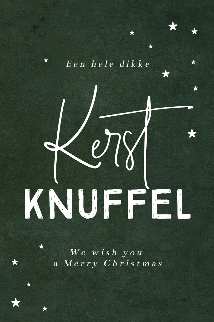 Een feestelijke goudfolie kerstkaart met de tekst 'kerst knuffel' en sterretjes op een donkergroene achtergrond.