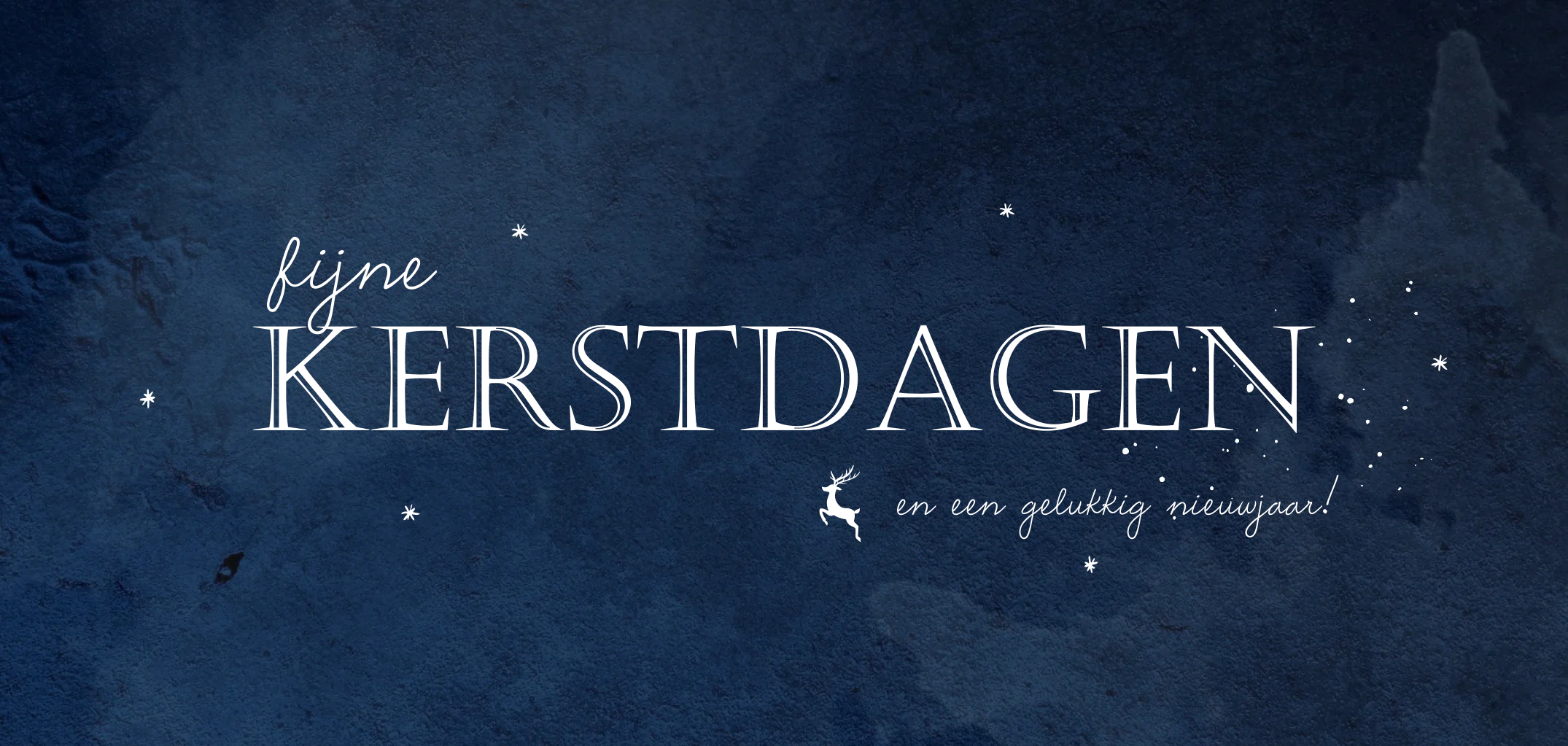 Een stijlvolle kerstkaart panorama enkel model, in nachtblauw met kleine sterretjes op de achtergrond. De tekst staat in grote moderne letters in het midden, eronder een klein rendier. Door de goudfolie krijgt de kaart een luxe uitstraling! Tekst en lettertypes pas je eenvoudig zelf aan in de online editor.
