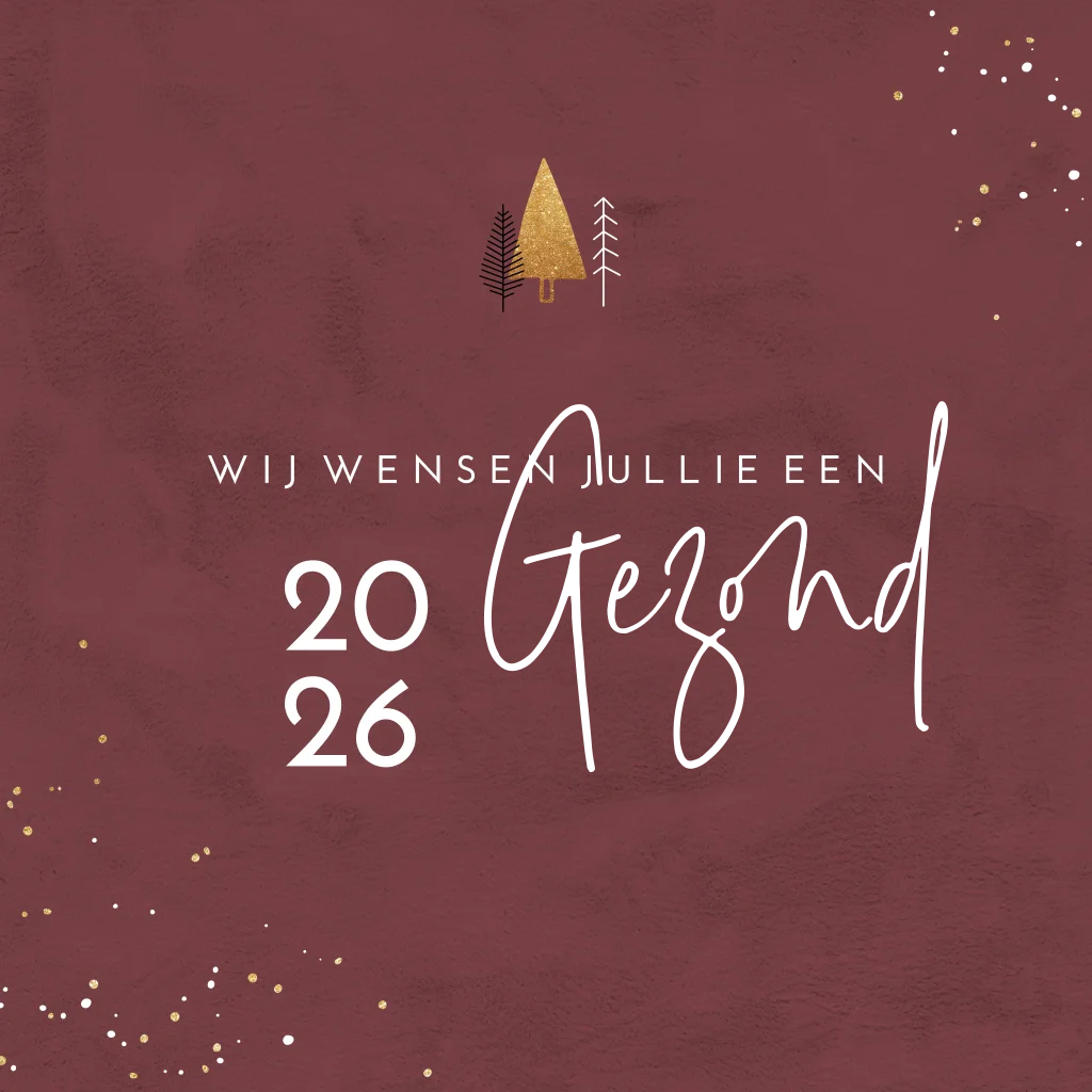 Stijlvolle vierkante kerstkaart in aubergine kleur. Boven de mooie typografie staat een kerstboompje en in de hoeken verfspetters. Verschillende elementen worden afgedrukt in goudfolie. Personaliseer dit kaartje in de online editor.