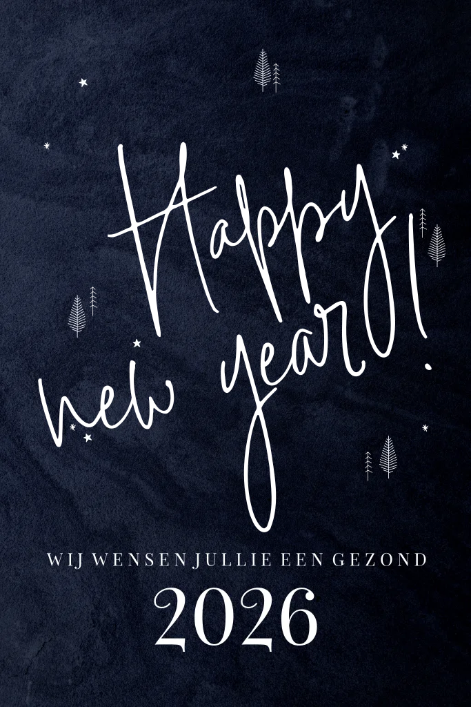 Mooie donkerblauwe kerstkaart met kleine kerstboompjes en sterretjes op de achtergrond. Met de hippe letters in goudfolie krijgt de kaart een luxe uitstraling. Personaliseer het kaartje gemakkelijk in de online editor.